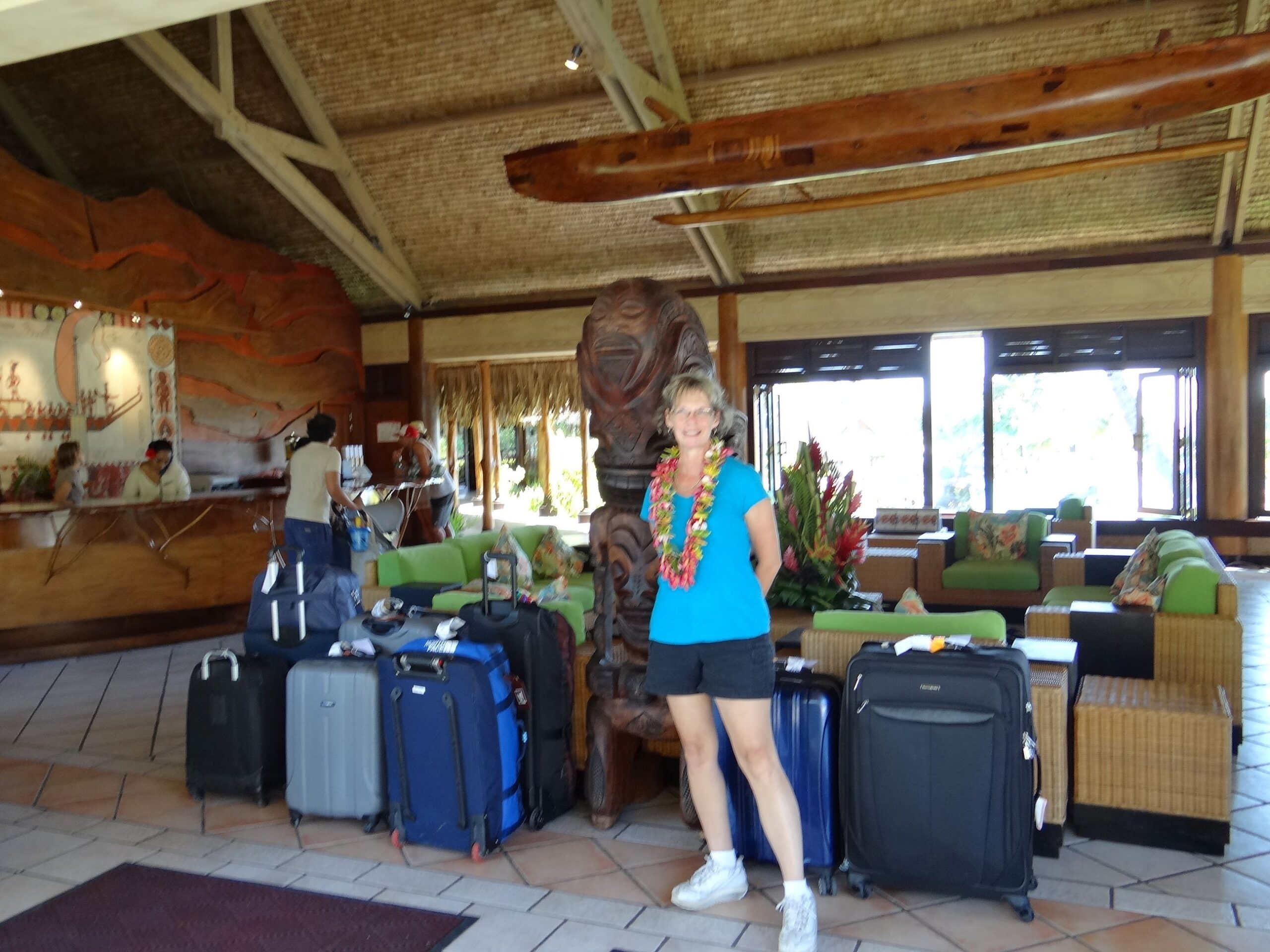 To get to Moorea we had to fly to Los Angeles, get a flight to Papeete, Tahiti after midnight Los Angeles time, and then take an island hopper to Moorea. We arrived pretty early local time so we had to hang out in the hotel lobby for a few hours waiting for our bungalow to be ready. Here’s Glenda in the hotel lobby with our luggage, and some other people’s, beat but smiling anyway.