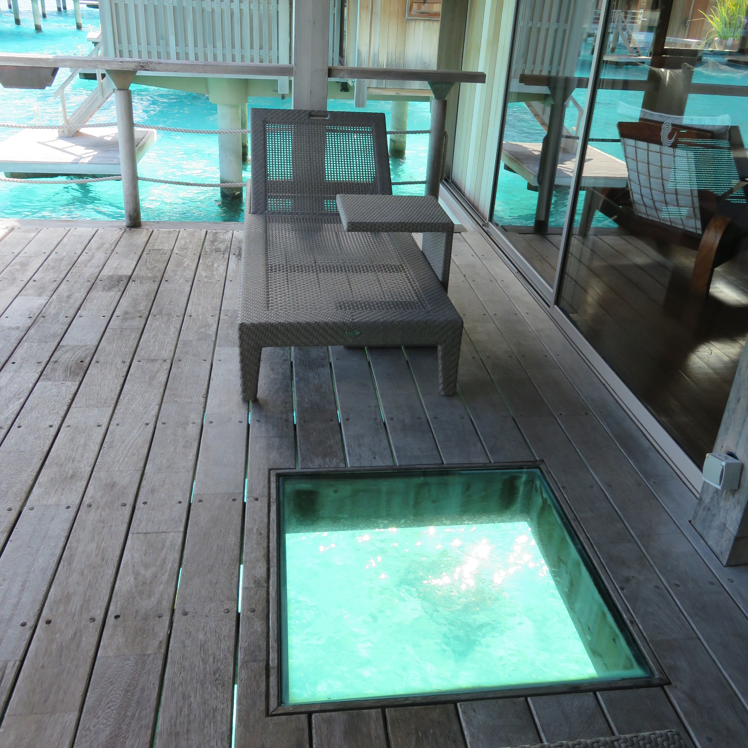 The deck of our bungalow with what we called a “fish window”. There were a few more inside the bungalow. They were very interesting at night as there were lights under the bungalow you could turn on and see what was going on in the water under the bungalow at night.
