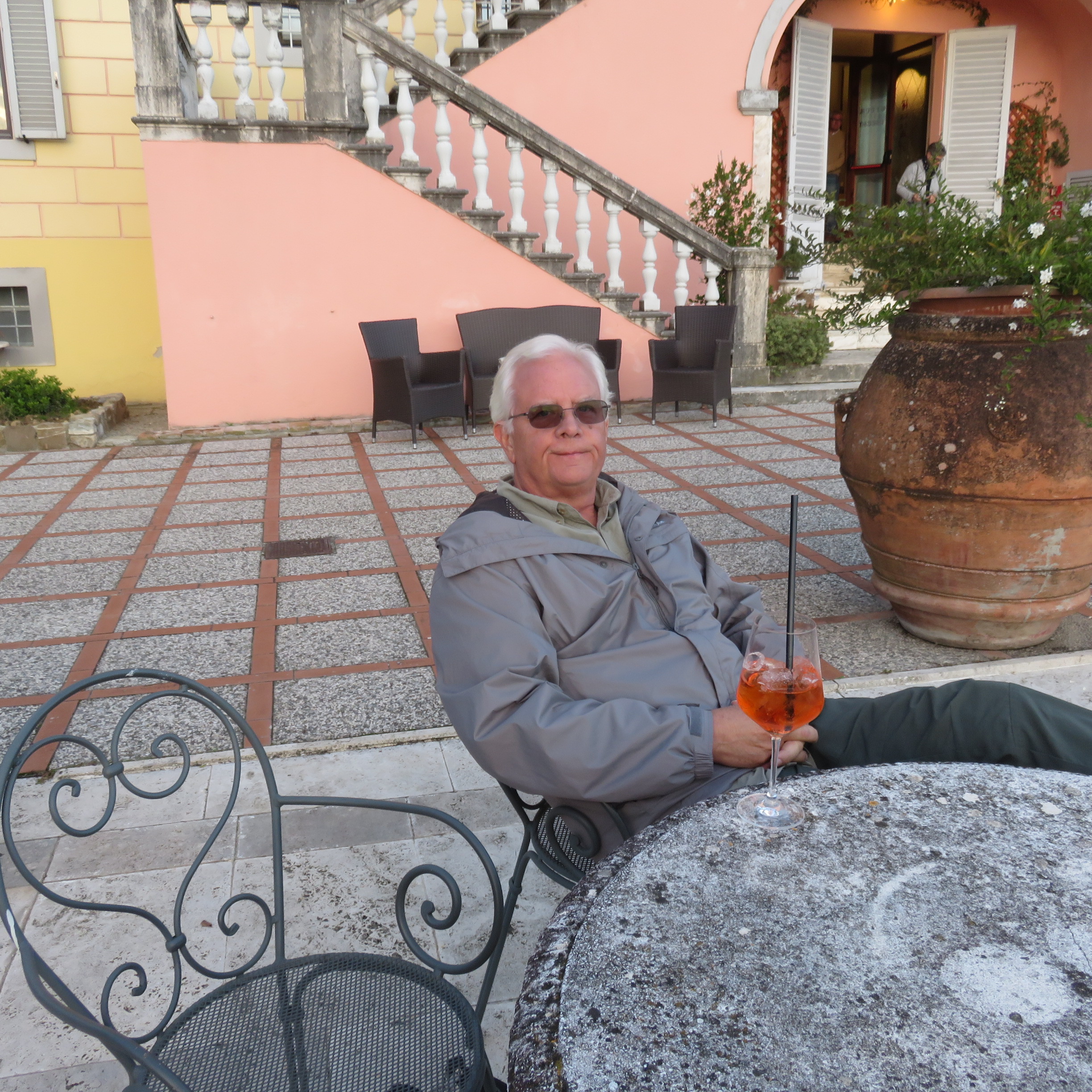 First time on the terrace at the hotel with the hotel behind Stan. Next picture shows the view the other way.