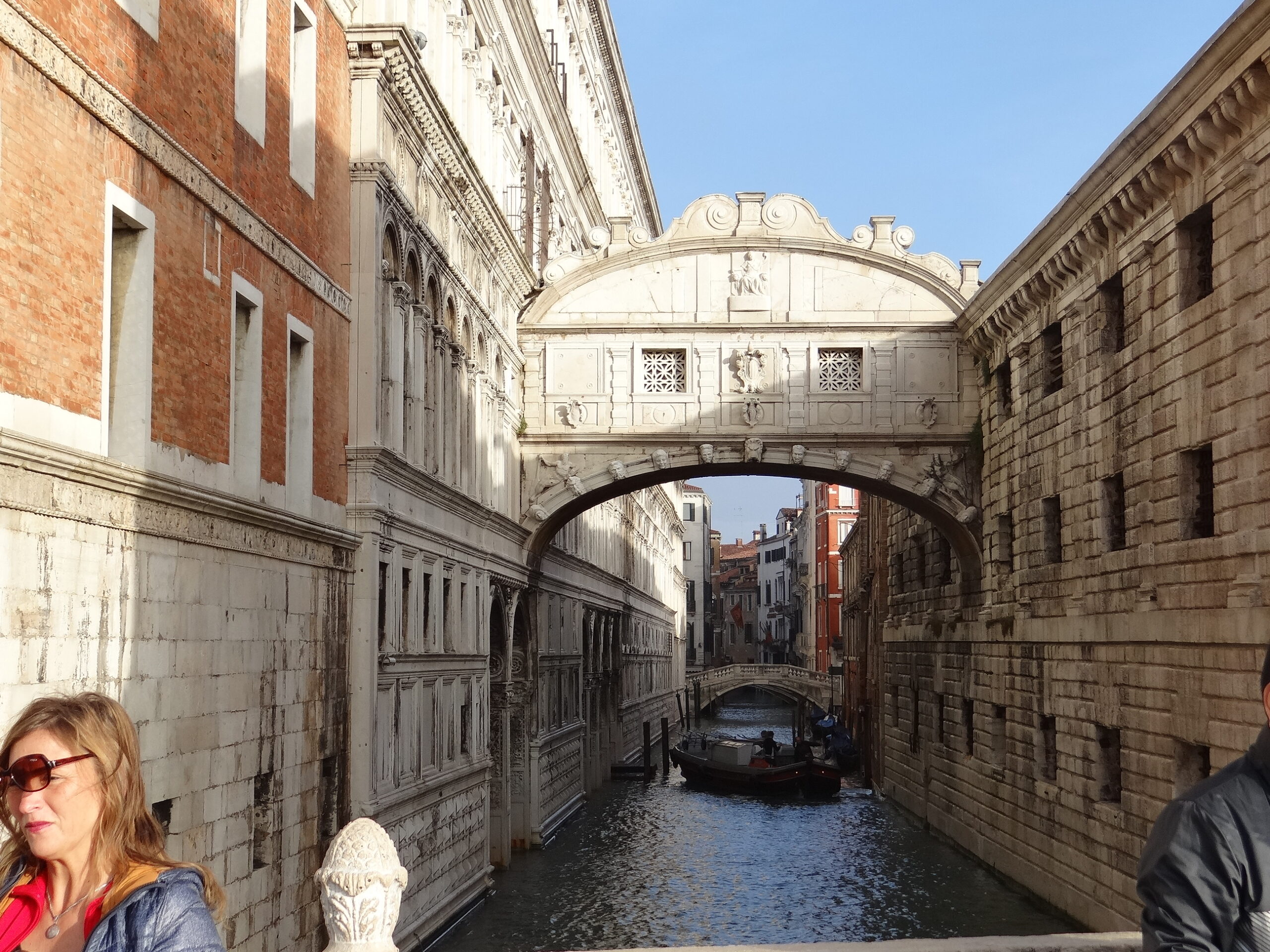 Passing by the Bridge of Sighs which connects the Doge’s Palace on the left to the New Prison on the right. It was called that because prisoners had their last sight of Venice through the grill covered windows on the bridge on the way to their cell.