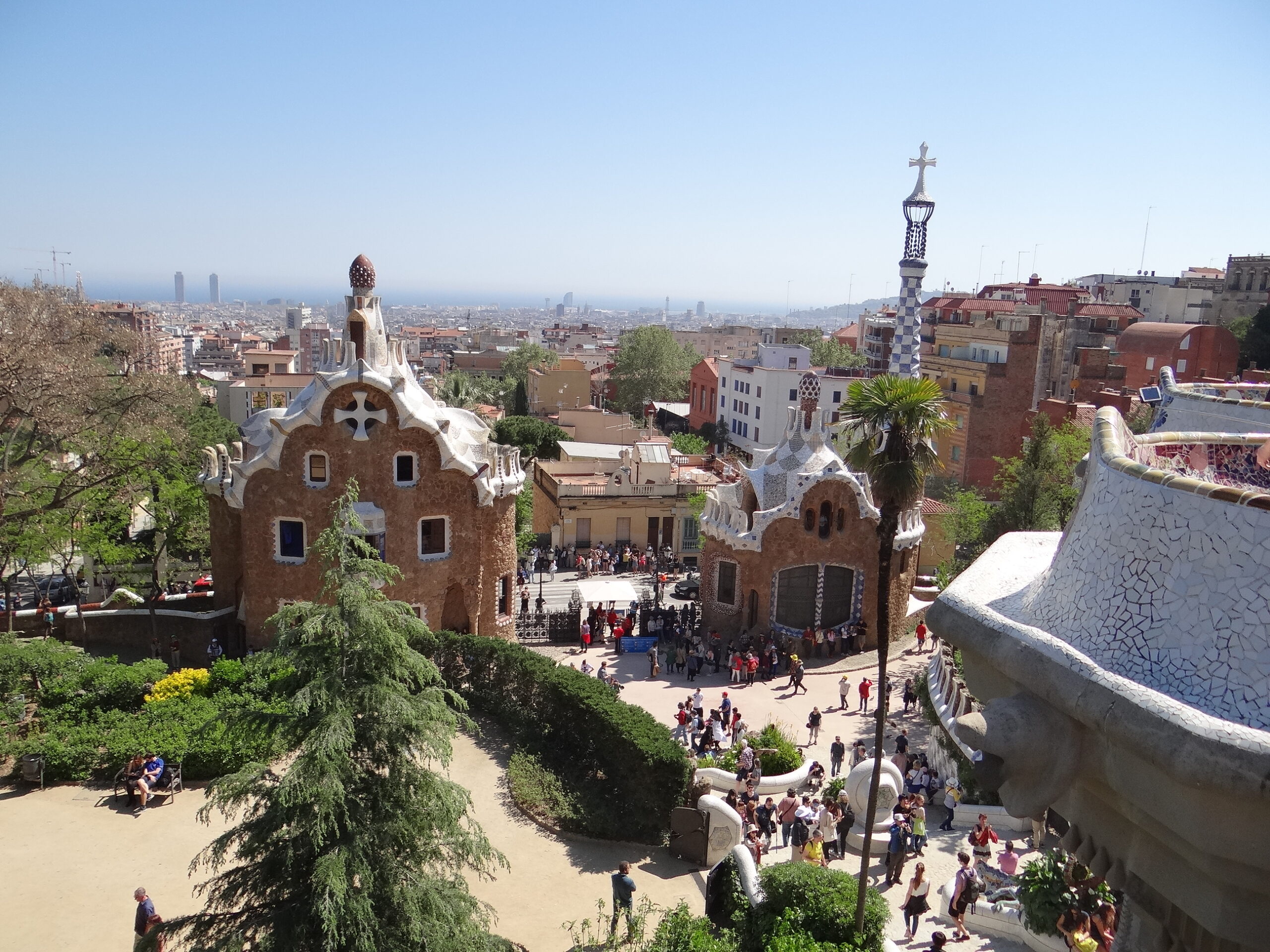 The “gingerbread houses” at Park Guell. The structure at the right edge of the picture is the seating area from the previous picture.