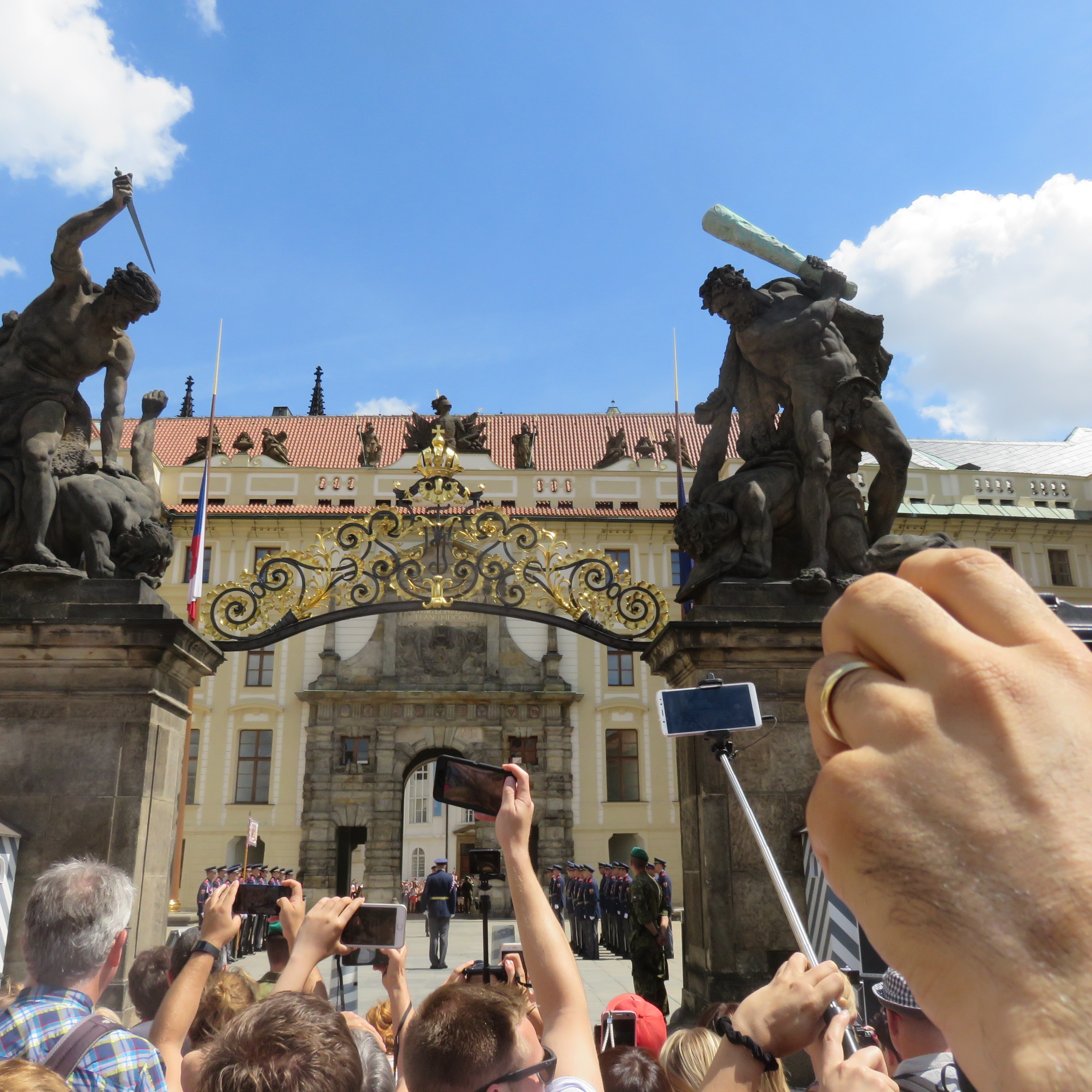 The Matthias Gate at Prague Castle in the Czech Republic. The gate is flanked by the statues of Fighting Giants. The crowd is watching the ceremonial changing of the guard, which takes place in the first courtyard of the castle.