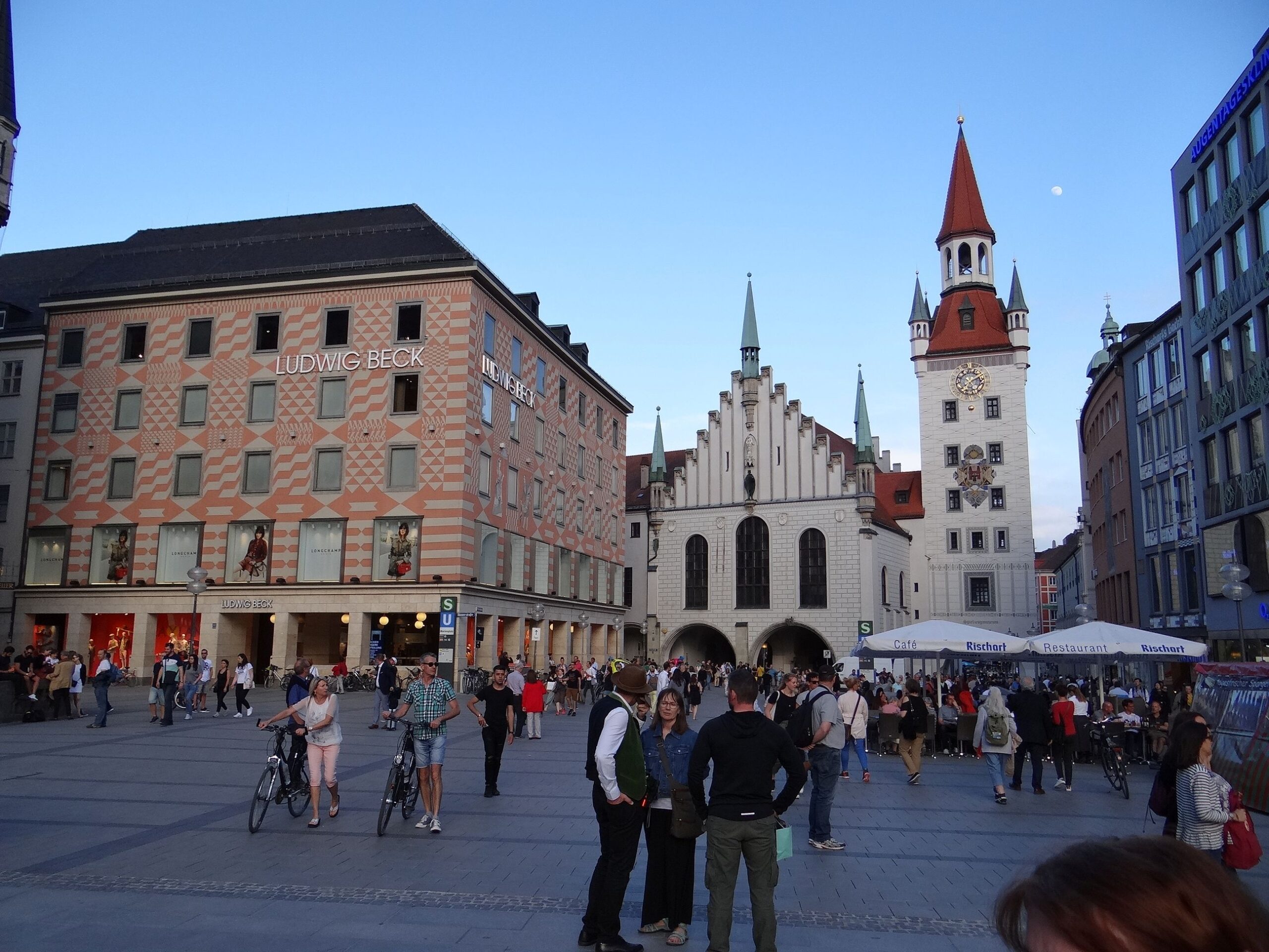 End of the day we were in Munich, Germany. Picture taken from the central square in Munich, the Marienplatz, of the Altes Rathaus (Old Town Hall), the building with the distinctive red-topped tower and clock on the right side.