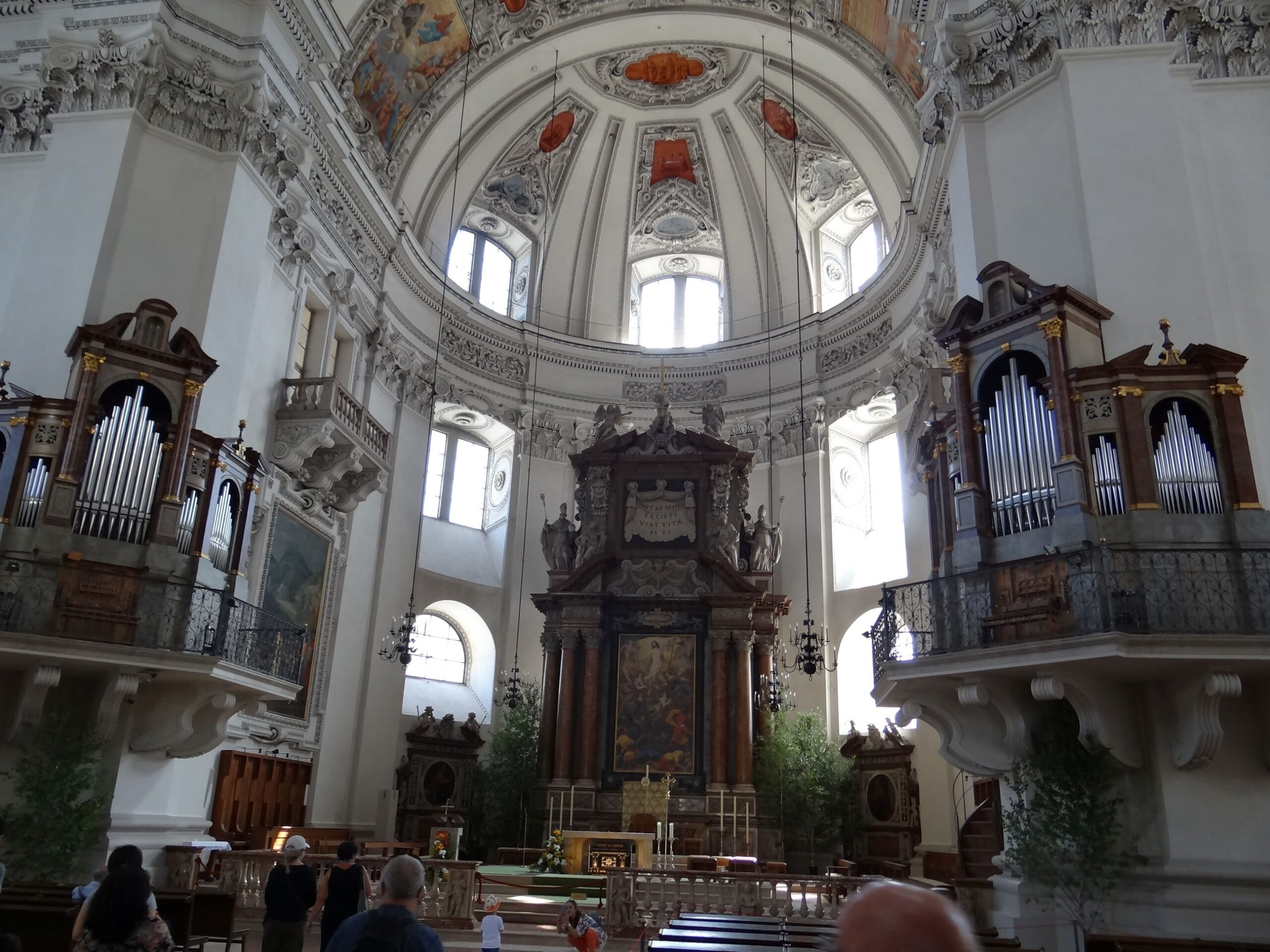 Interior of the Salzburg Cathedral looking toward the altar. In this picture you can some of the organ’s 4,000 pipes. The cathedral also contains the baptismal font that was used to baptize Wolfgang Amadeus Mozart.
