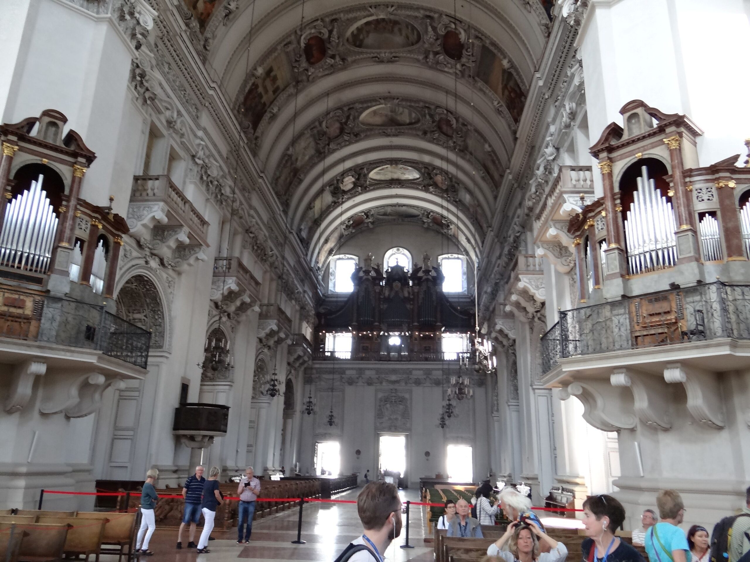 Interior of the Salzburg Cathedral looking from the altar to the entrance.