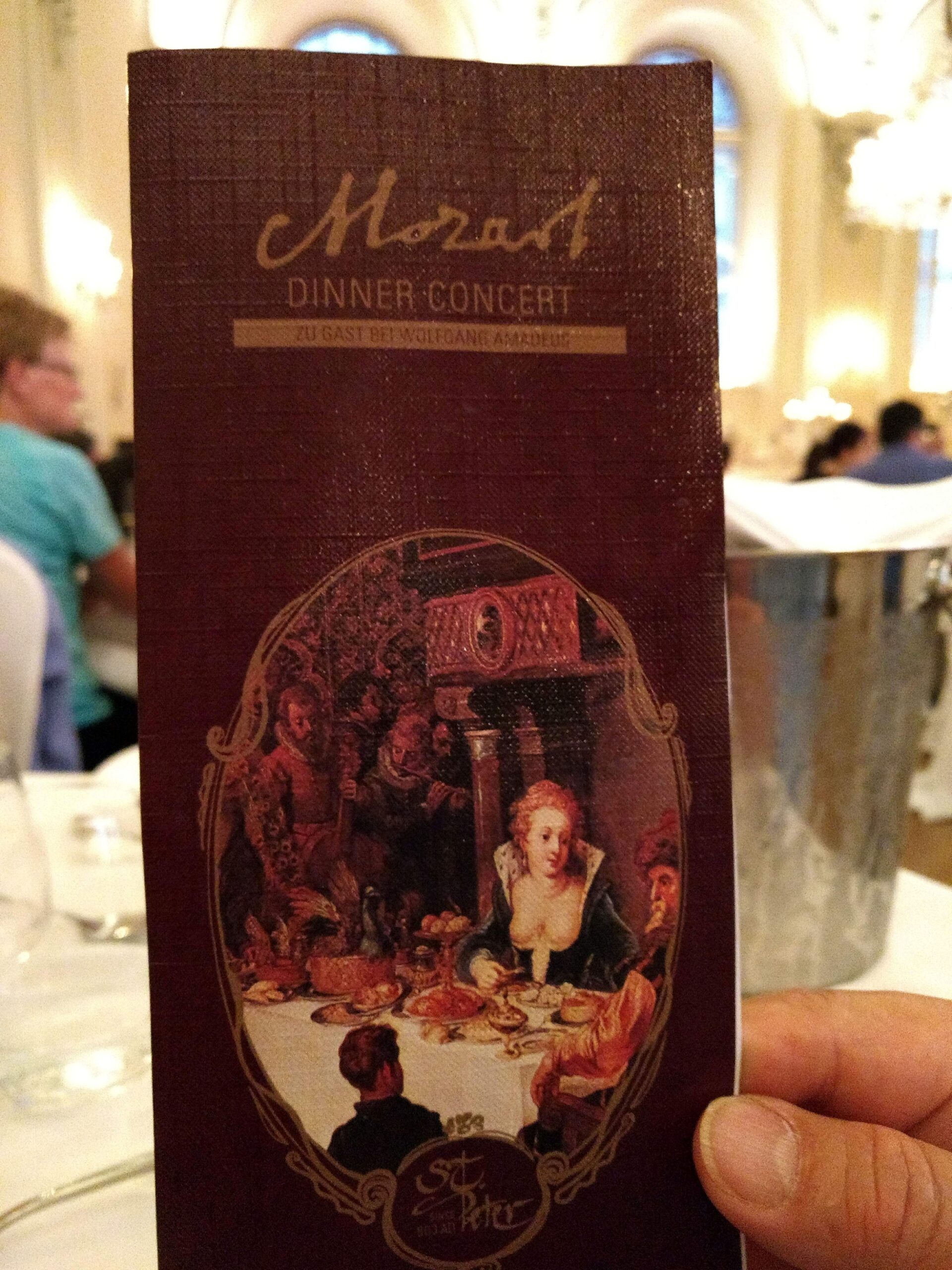 That evening we attended the Mozart Dinner Concert, which takes place in the Baroque Hall of St. Peter Stiftskulinarium in Salzburg, Austria. It is one of the oldest restaurants in Europe, with a history dating back to 803 AD. This is the menu for the 3 course meal that also lists the music that is played and sung by a live group in period clothing.