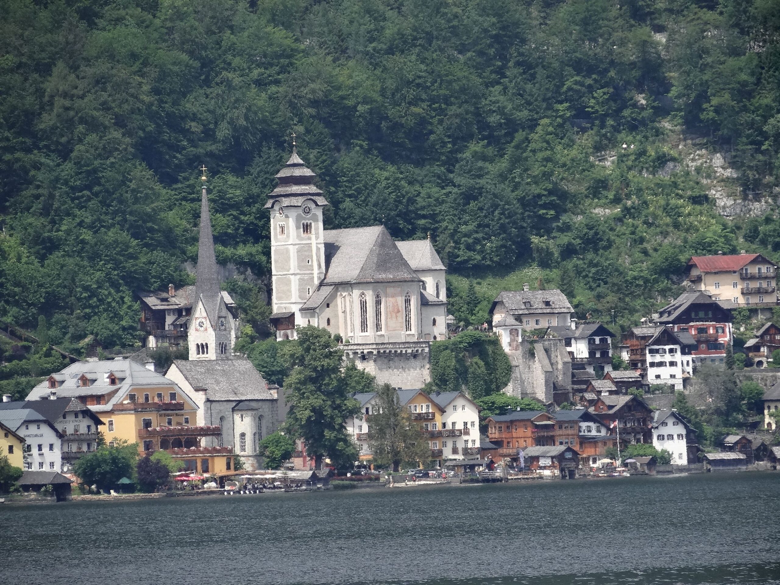 After a trip around the lake the boat is heading to our hotel’s dock, the yellow building on the left with the dormer windows in the roof. Our room was up in the top level with one of those windows.