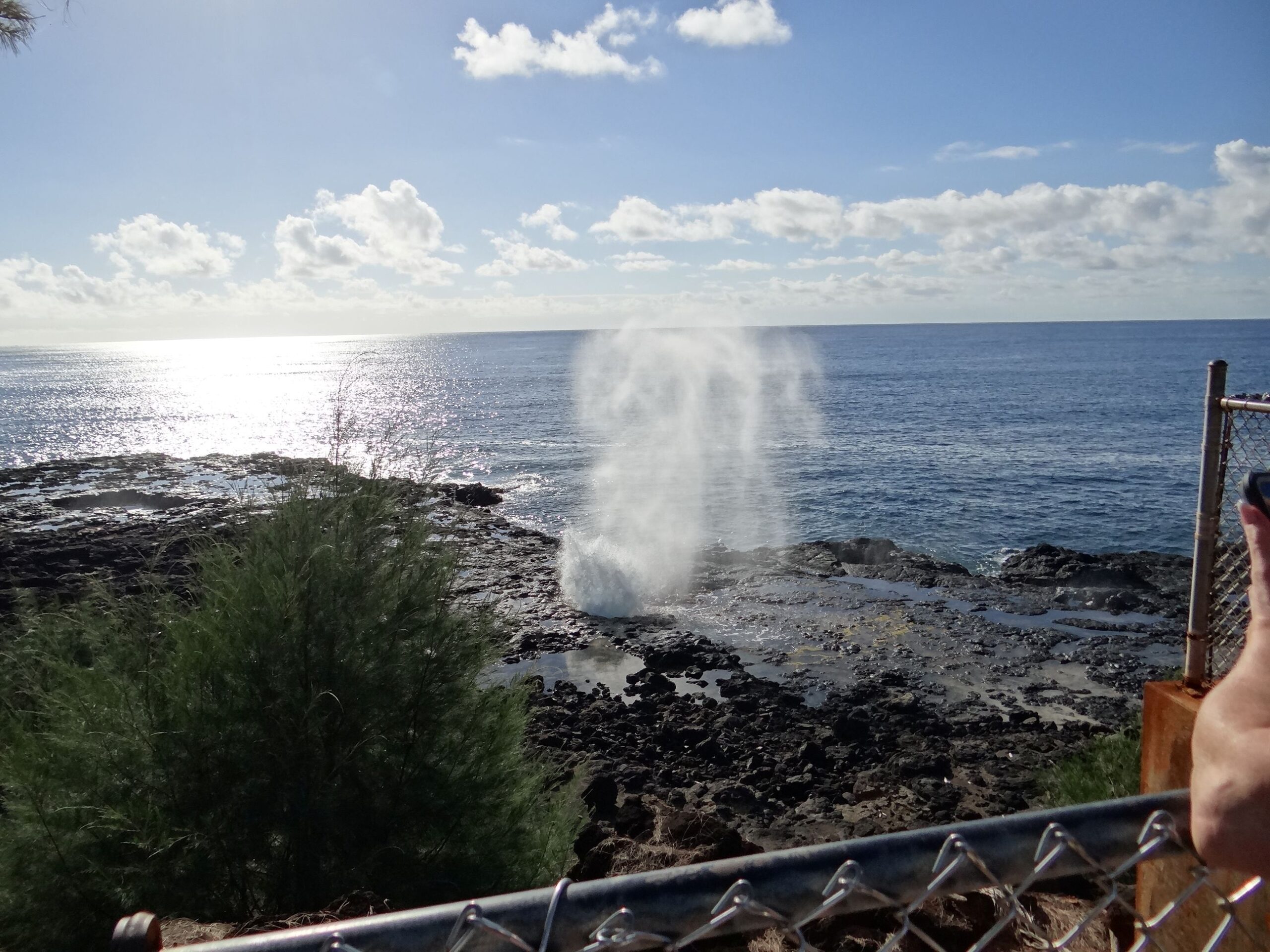 Spouting Horn blowhole, one of the most photographed spots on Kauai. The surf channels into a natural lava tube here and releases a huge spout of water that can reach as high as 50 feet into the air. There’s also a hiss and a roar that is the basis of a Hawaiian legend about a giant lizard stuck in the lava tube.