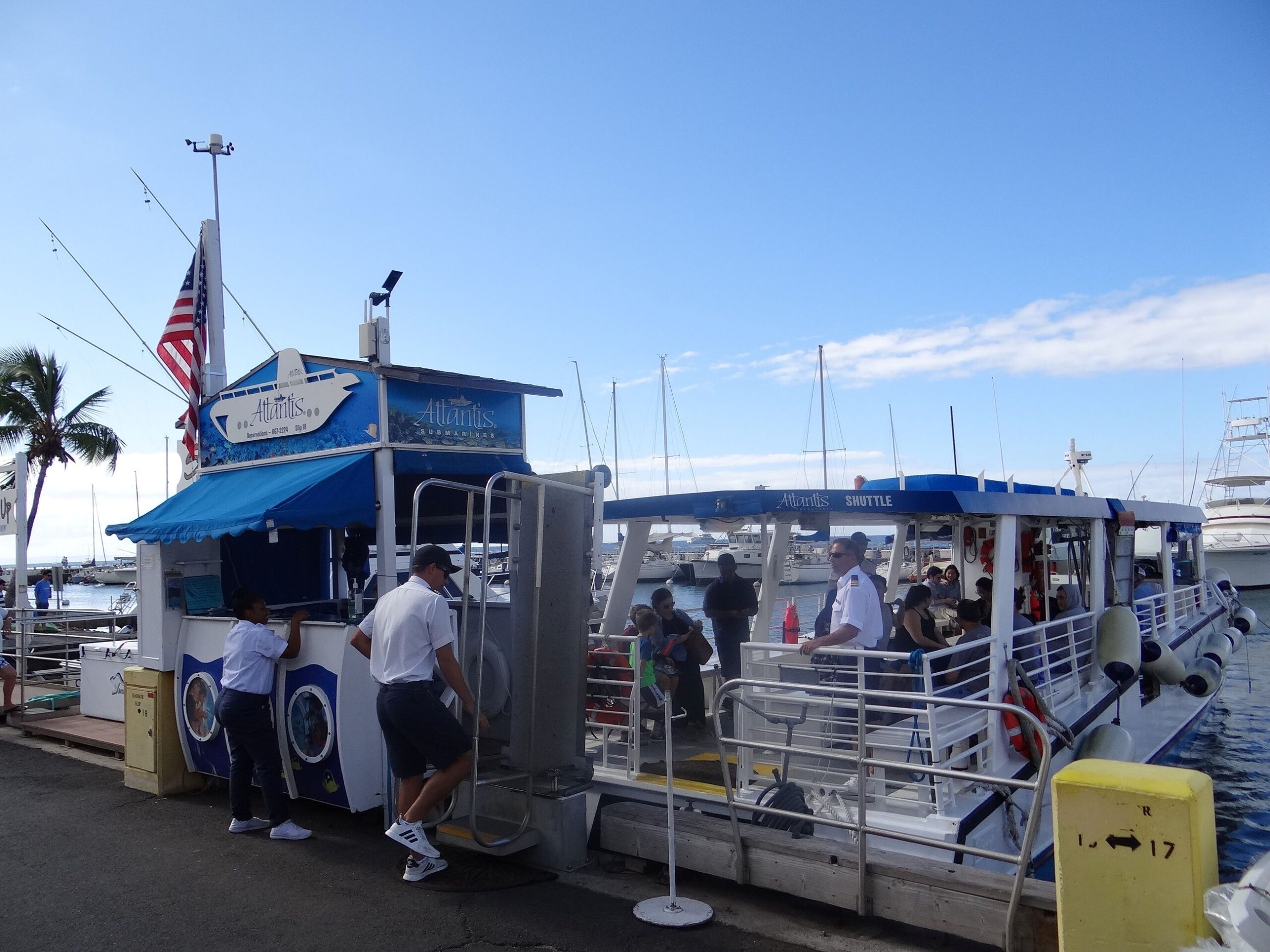 Getting on the boat that takes us to the submarine for our submarine adventure.