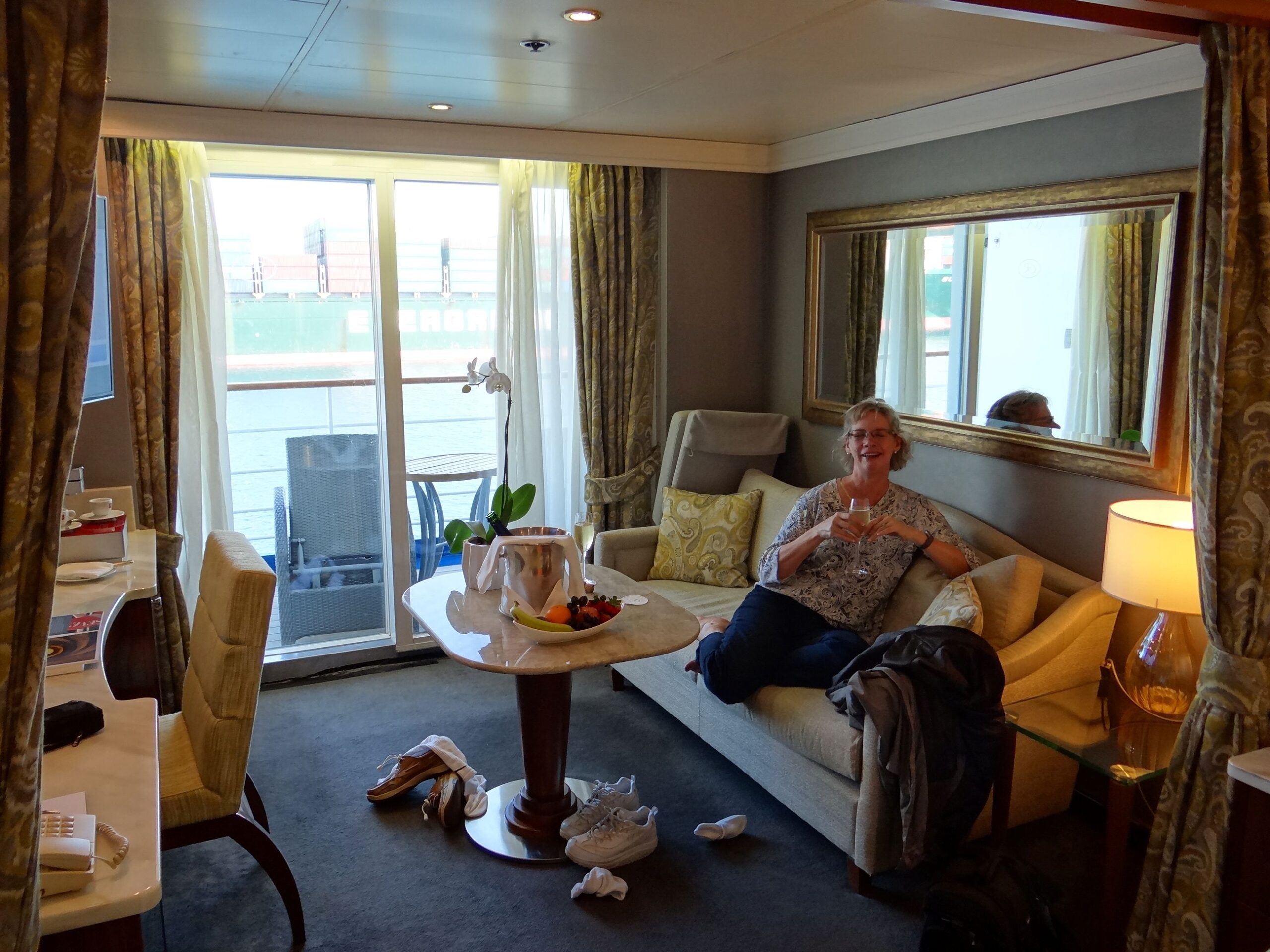 Finally in our room with our shoes kicked off and working on the welcome bottle of champagne.
