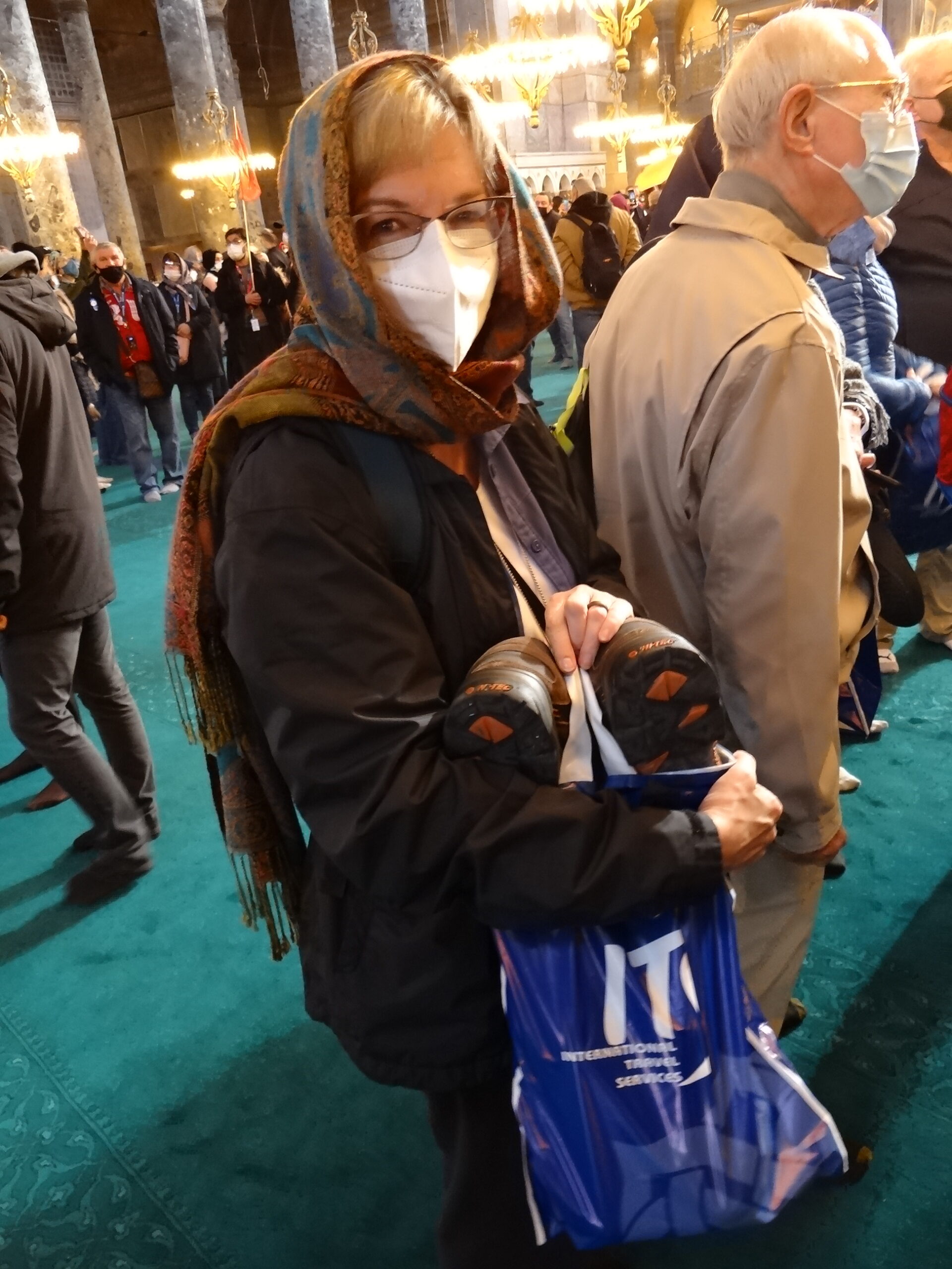 Glenda in the Hagia Sophia with her head covered and carrying a bag with our shoes.