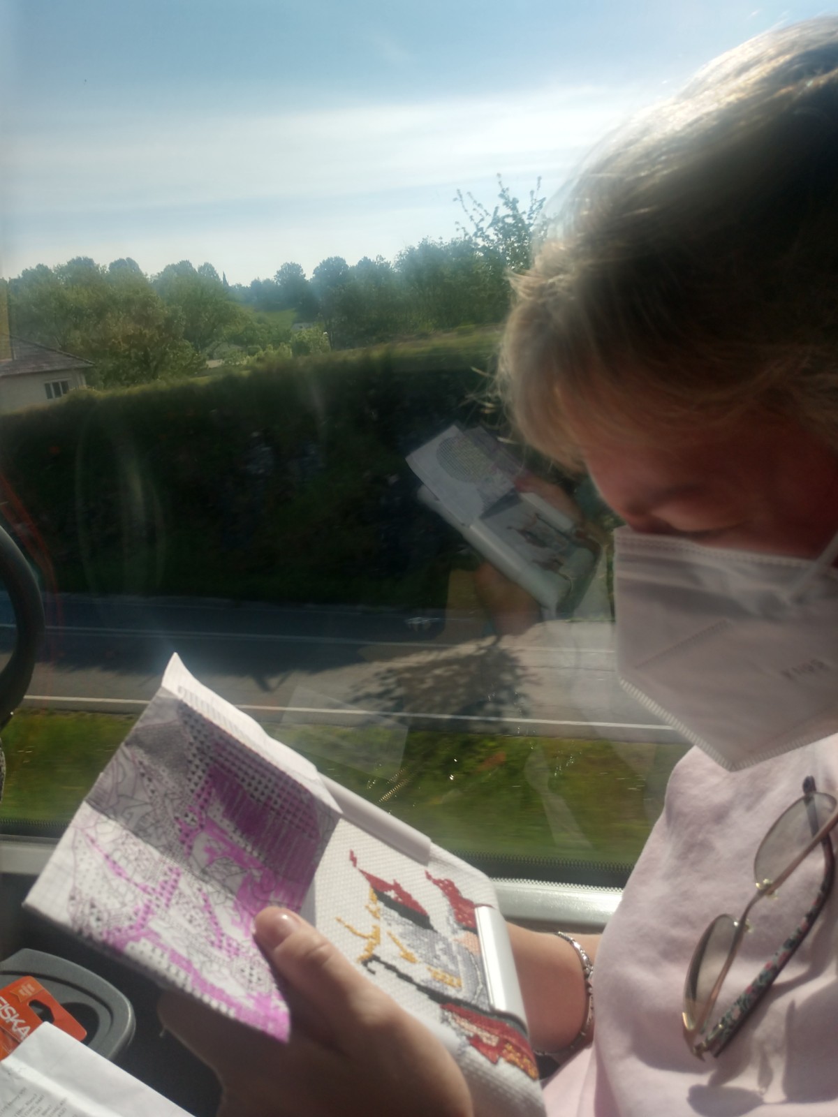 Next day was an all day bus ride. Glenda used the time to work on her stitching.