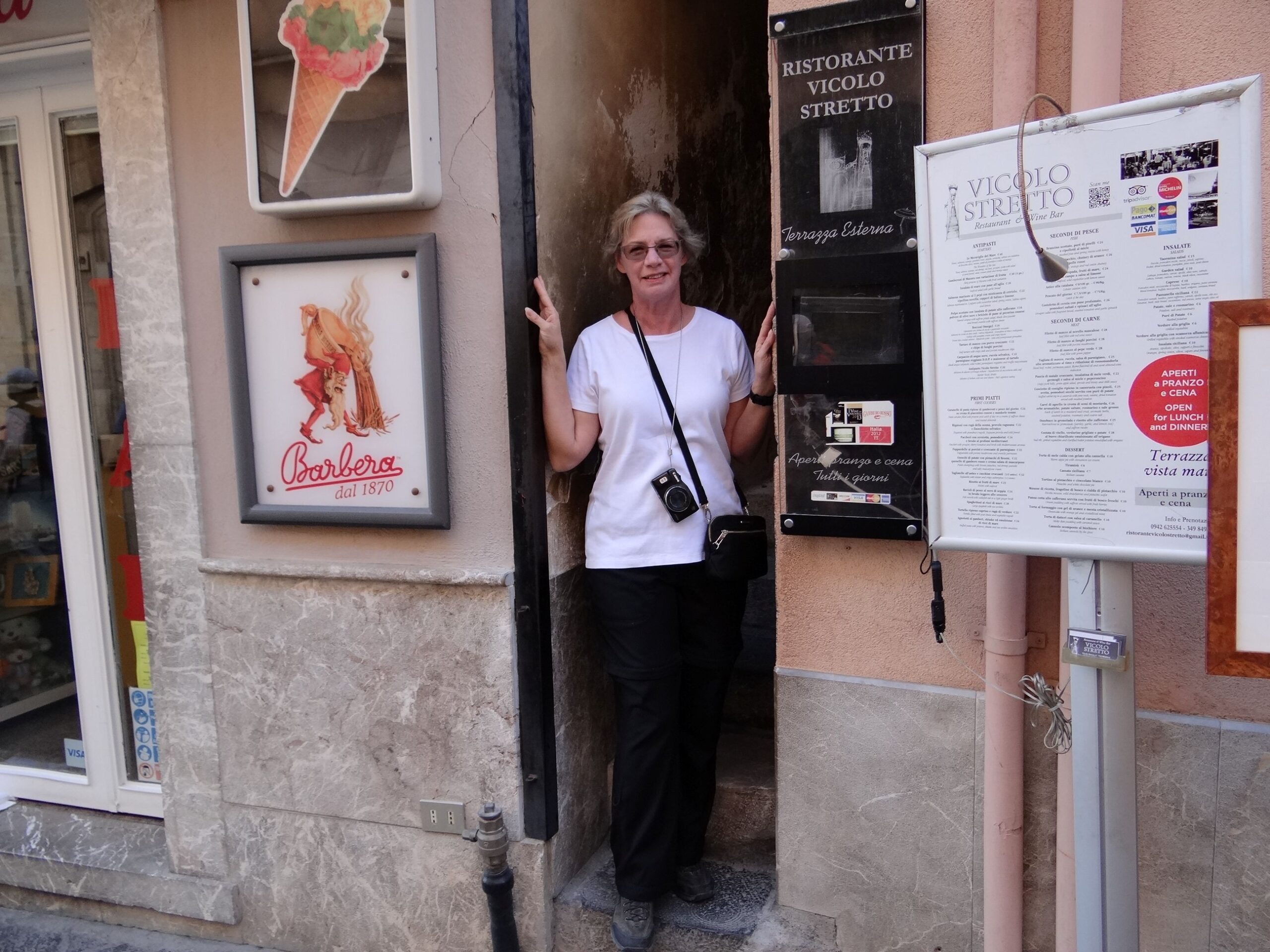 Glenda standing in the entrance of the Ristorante Vicolo Stretto in Taormina, Sicily. The restaurant is known for its narrow, steep entrance which your typical American tourist might have trouble fitting through.