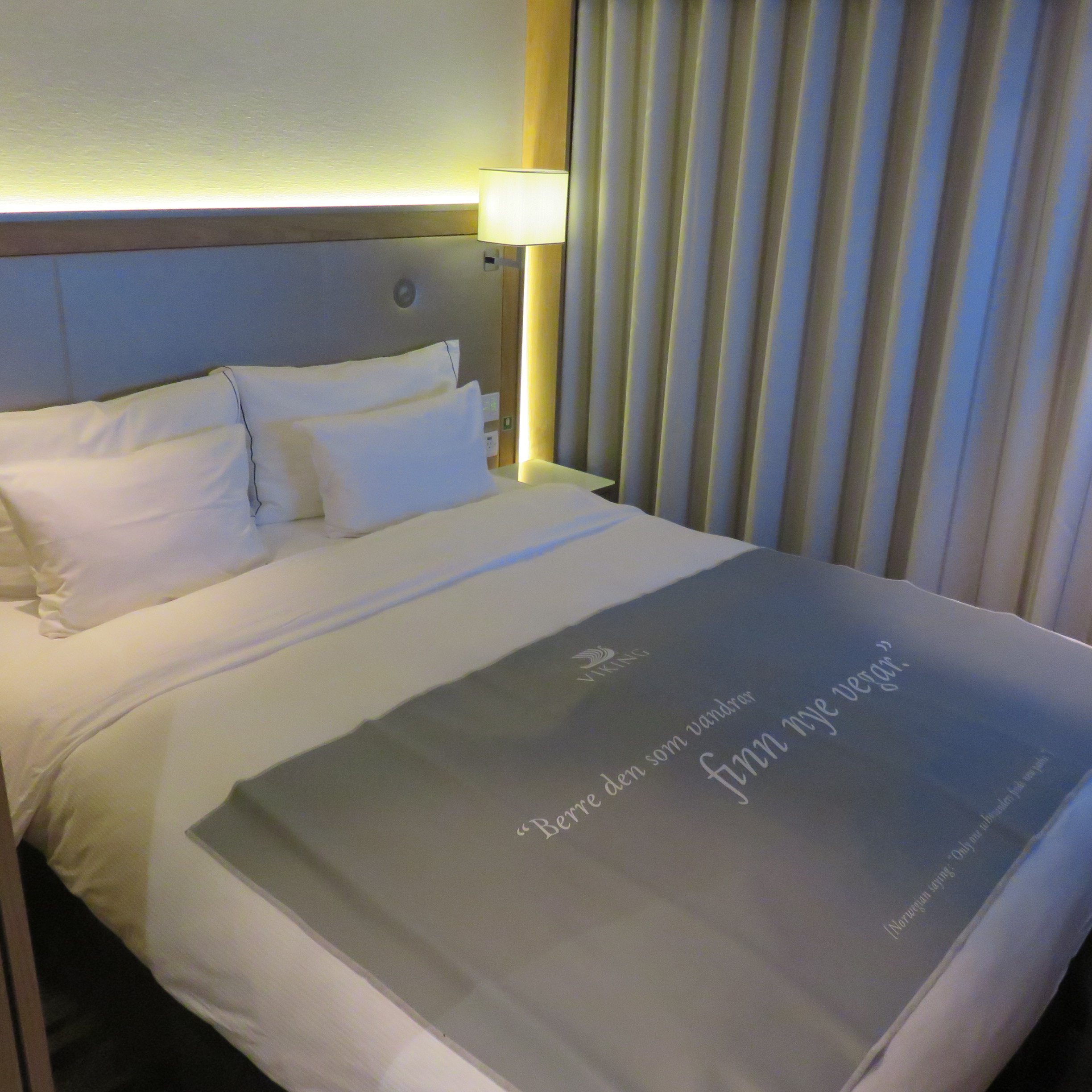 End of the day we and our bags are on the Viking Alsvin, a duplicate of the Idi just in a different location. Here’s the welcome mat on our bed.