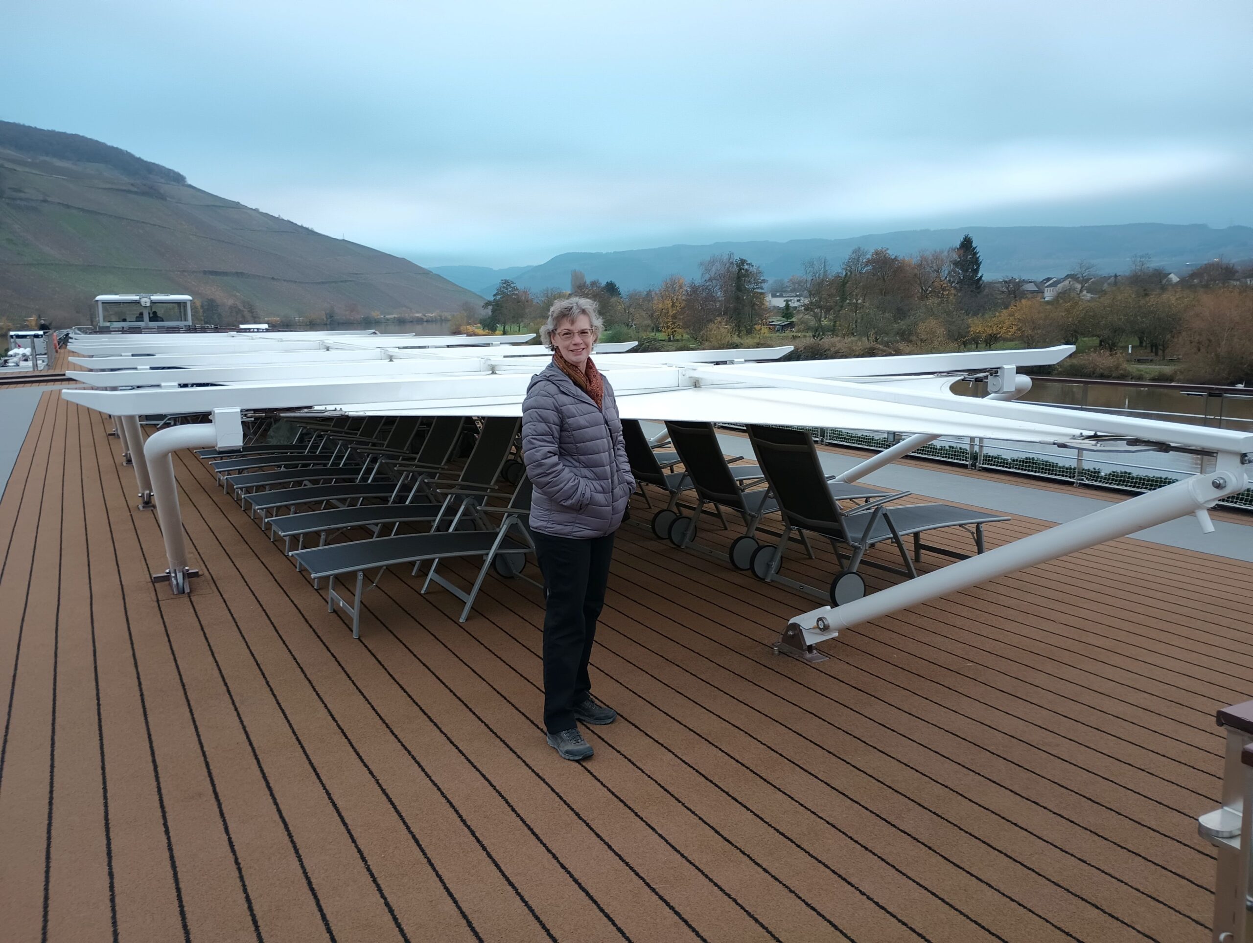 So we headed up to the top deck to see what we could see up there. They had all the supports for the covers over the chairs and tables folded down to prepare for going under bridges that would be a very close squeeze due to the flooding. If you go the Videos menu at the top of the page, then to 2023 Viking River Cruise Videos you can find a video of the pilot house being lowered so the boat can pass under a bridge, or you can go there now (opens in a new tab): 2023 Viking River Cruise Videos