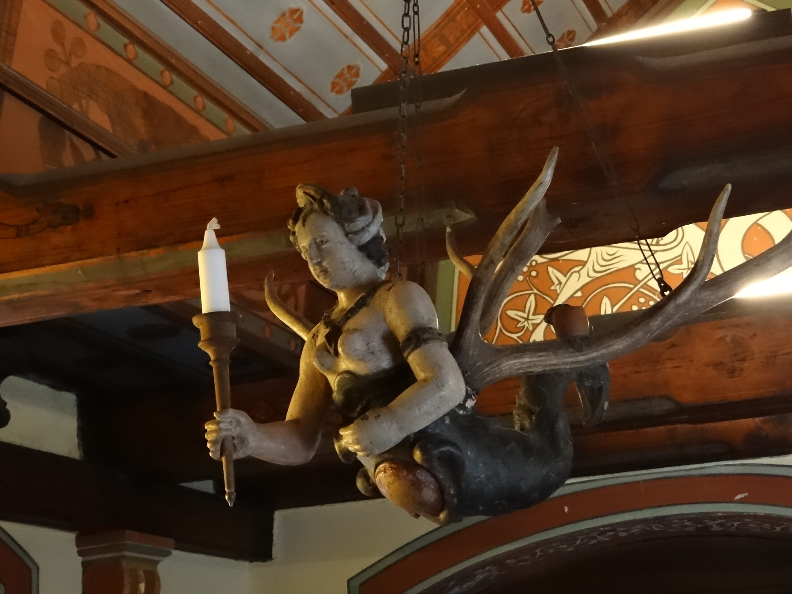 Interesting item in the castle. It’s called a Lüsterweibchen, a traditional German chandelier style featuring a carved figure—often an angel or mermaid—combined with deer antlers that originated in the late Middle Ages.