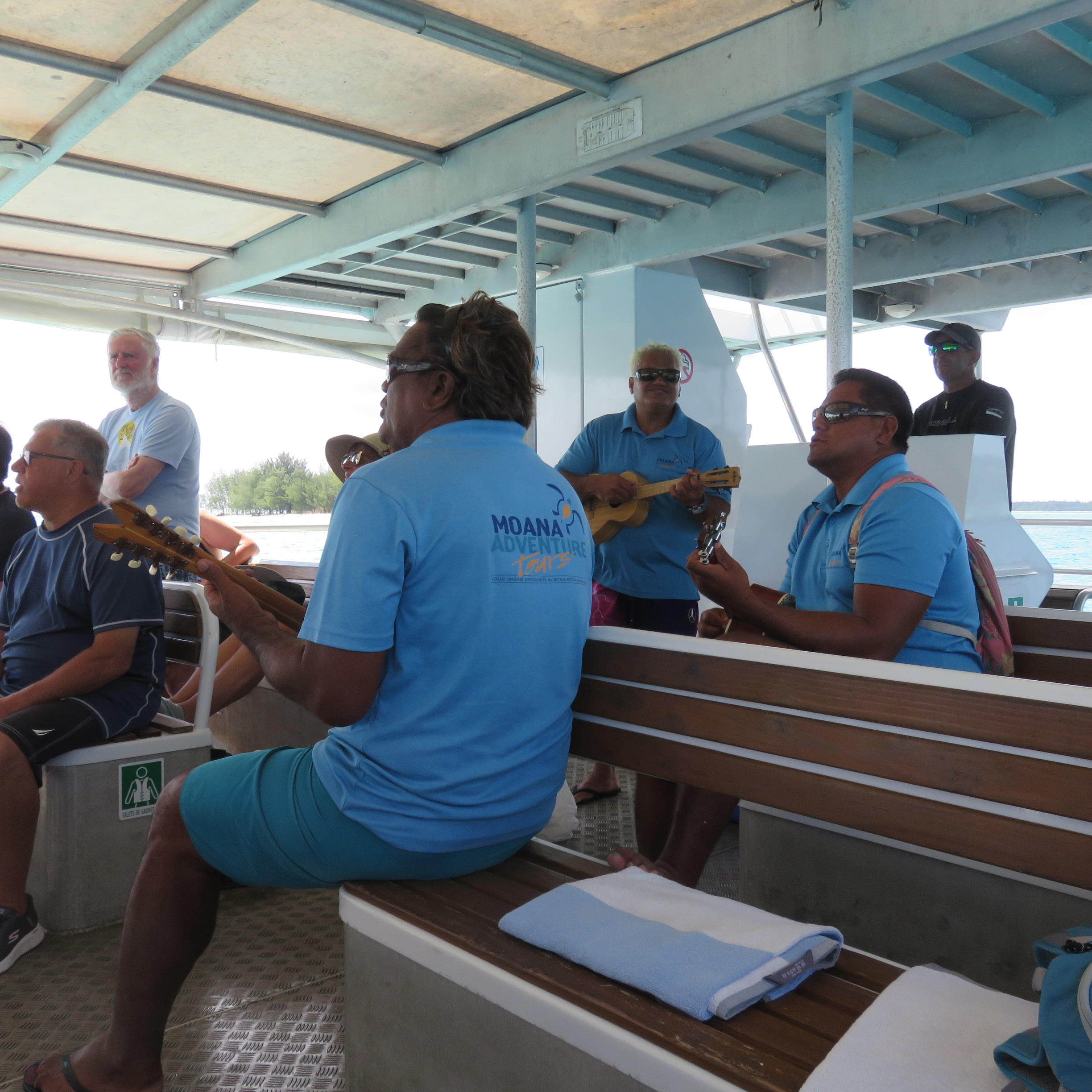 Did a snorkeling tour in Bora Bora. Picture taken on our way out to the first snorkeling site. The guys in the picture sang on the way and there’s a video of some of it under the 2024 South Pacific Cruise Videos under the Videos menu item at the top of the page, or you can go there now (opens in a new tab): 2024 South Pacific Cruise Videos.