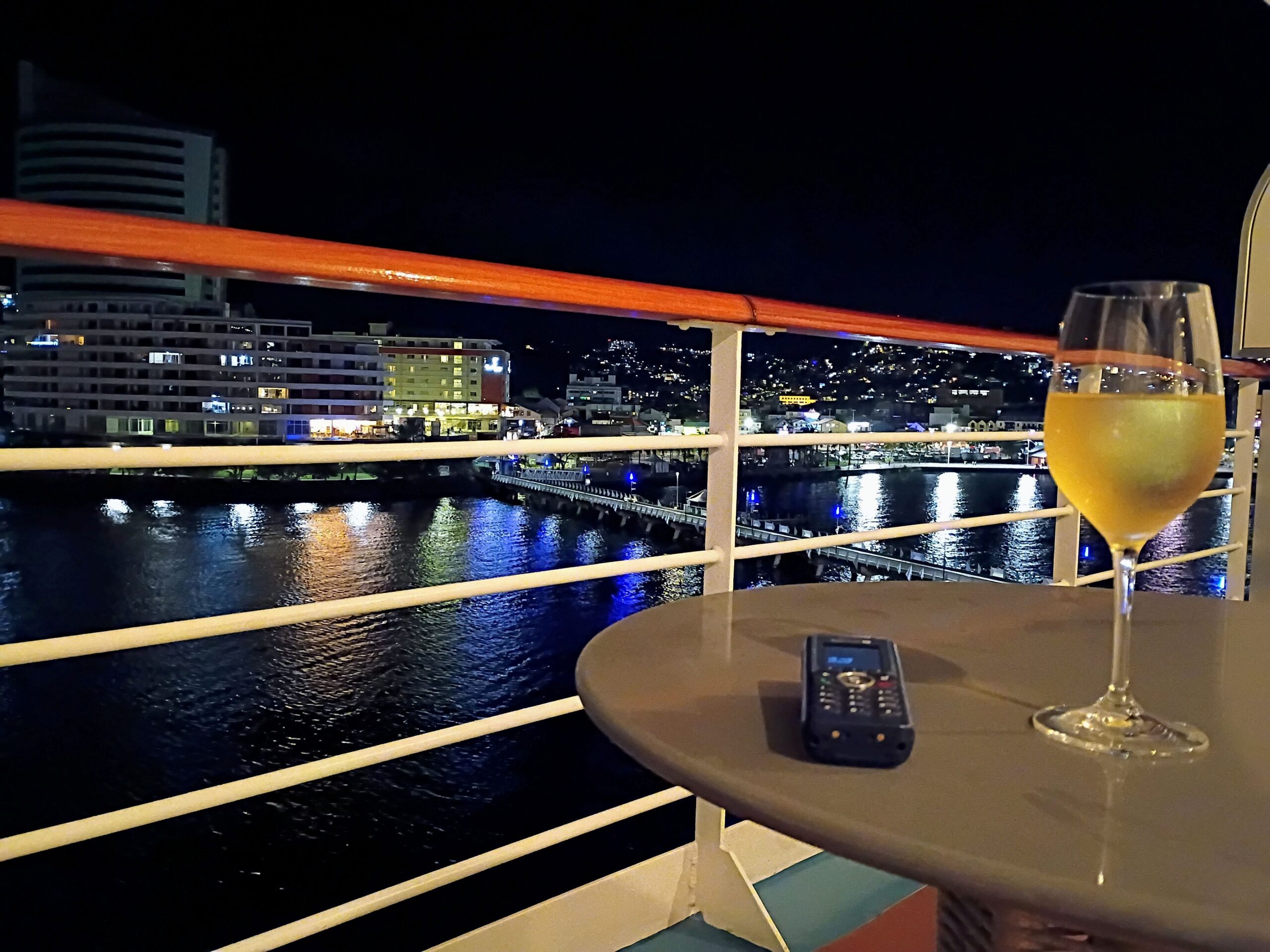 Watching the ship leave Martinique from our balcony. Our suite had 3 phones, 2 wired and one cordless, that’s the cordless one on the table so we could call our butler from the balcony. It was a rough cruise.
