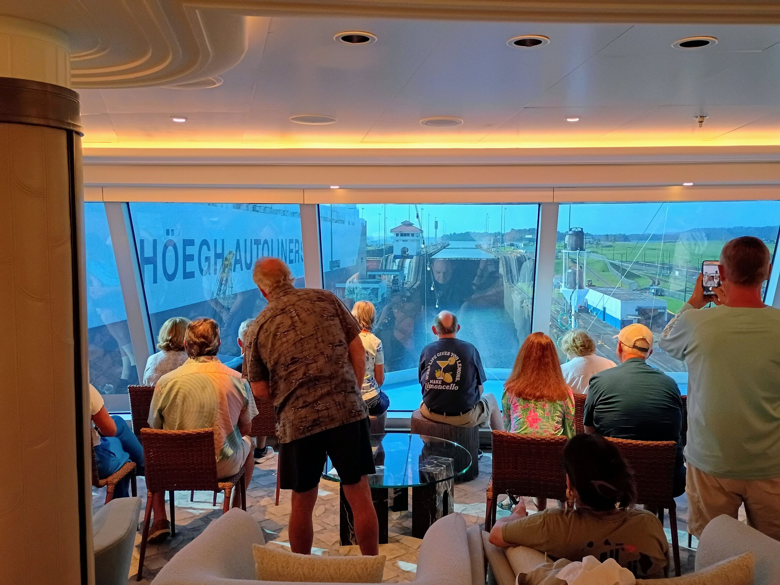 Pretty much all the next day was spent going through the Panama Canal. Here we’re just entering the first locks, the Gatun Locks, which consist of three chambers that lift ships 85 feet from sea level to the artificial Gatun Lake. On the left is a ship going the other way just exiting the locks.