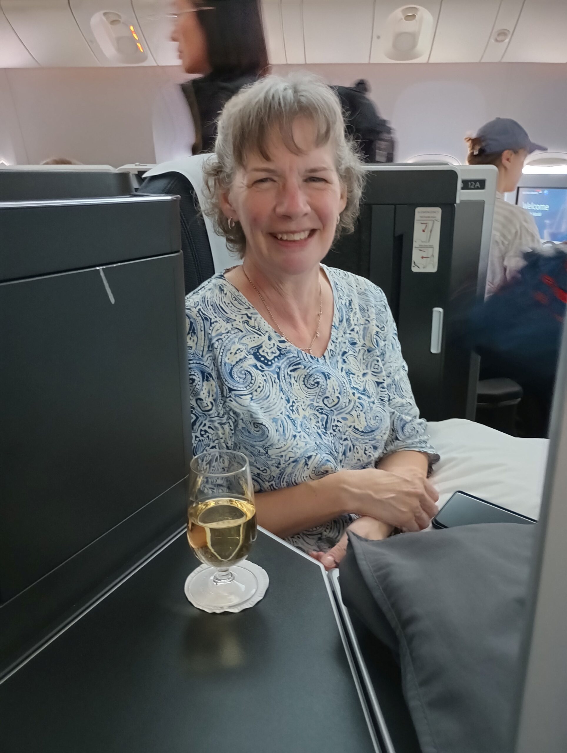 Settled into our pods with our welcome drink waiting to takeoff on our flight from Austin to London Heathrow.